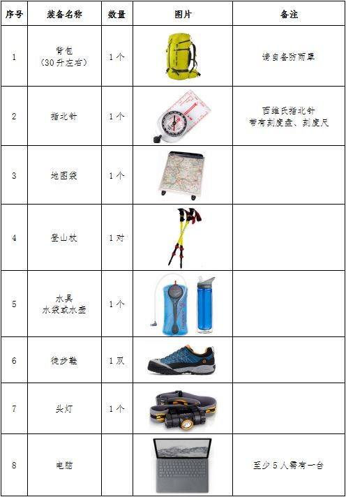2、装备清单中所列的所有装备必需自备,此表中的装备仅为培训必备的最少量装备要求,如个人衣物、防寒衣物、洗漱用品等则需根据个人情况另行自备;