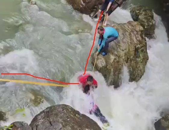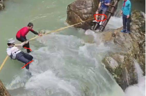 在涉水人员已经形成呛水窒息,需要及时救援脱离死亡V,但由于拦截绳两端没有采用类似意大利半扣的活结,而是被完全锁死(一端在梯子上,另外一端判断也是固定在树或石头上了),在巨大冲击力作用下无法被解开,最后绳索被拉断裂人员直接被冲走。
