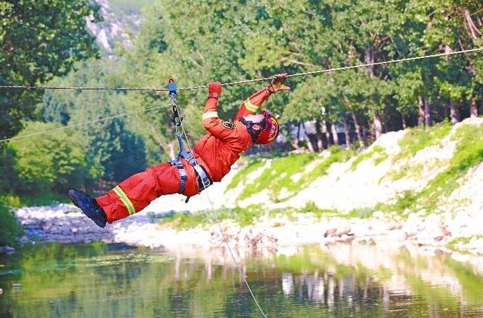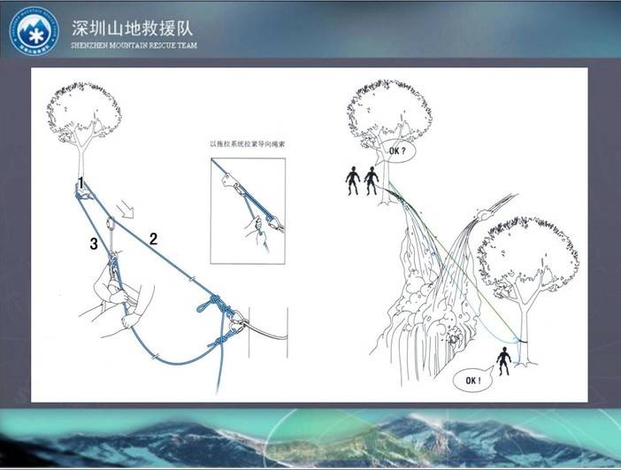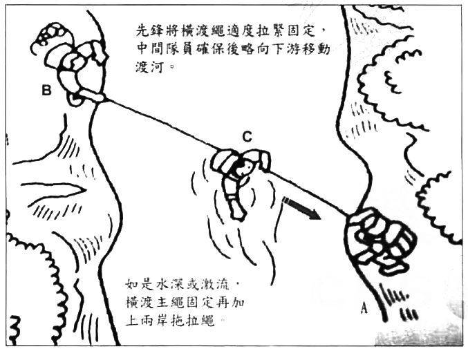 如果无法避免需要涉水,在水流流速不高,且人员技术装备充分的情况下,可采用斜拉牵引或钟摆法横渡水面。