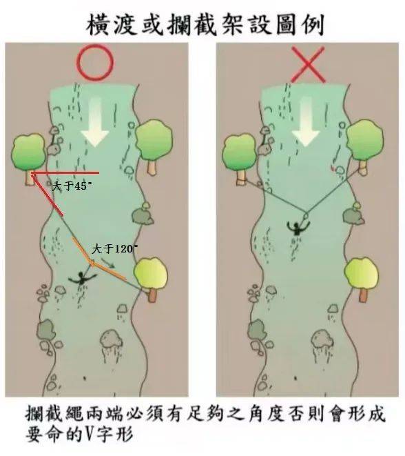 拦截绳索方向,要面向下游与水流方向形成足够的角度(最好大于45°);